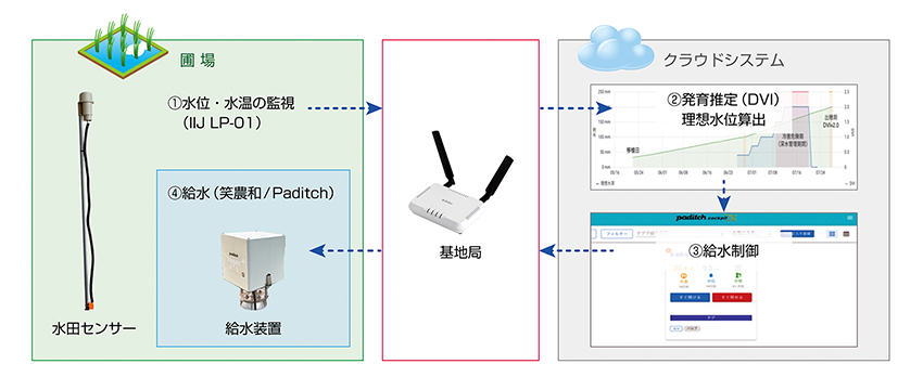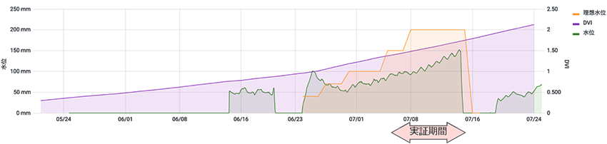検証は広さ2.0ha、1.2haの2つの圃場に、水田センサー(IIJ)、給水装置(笑農和)を各1台ずつ設置、移植日(5月中旬~下旬)から出穂期(7月下旬~8月上旬)の期間にDVIによる生育推定を行い、その中で幼穂形成期(6月中旬~下旬)から出穂期(7月下旬~8月上旬)の期間、本システムを使って自動水管理を行いました。