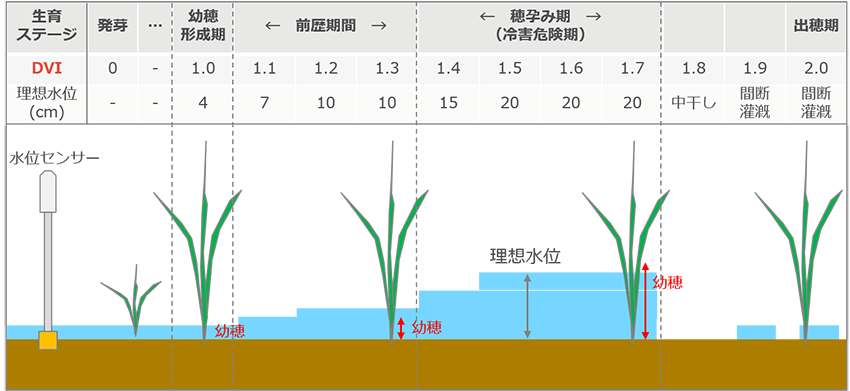 DVIを利用した水管理では、移植日の違いや地域の違いを意識することなく、栽培管理の比較・再現が可能になります。またDVIの算出方式には、営農者が経験則で判断していた気象・気候要素が指数として取り込まれているため、気象条件にも影響されにくい安定した水管理を行うことができます。