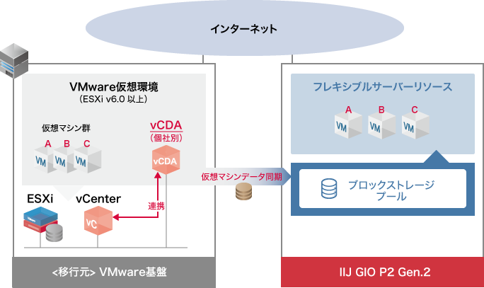 今回IIJ GIO移行ソリューションに追加する移行支援メニューは、GIO P2 Gen.2 フレキシブルサーバリソースのマイグレーション機能を使うもので、具体的にはVMware Cloud Director Availability(vCDA)を利用して仮想マシンのデータを同期します。移行元VMware環境にvCDAアプライアンスを導入し、クラウドサービスとの間で事前に移行元のデータを同期することで、切り替え時に最終同期が必要なデータ量を少なくすることができます。この機能により、移行時のサーバ停止時間を極小化でき、特に「停止させることが難しいサーバやシステムを保有している」、「移行対象のサーバ台数が多い」といったお客様のシステムをクラウド移行する場合に有効です。今回は、このvCDAを利用した移行作業を、要件別に分かりやすい料金体系でメニュー化し、専門的な知見を持ったエンジニアがお客様のクラウド移行作業を支援します。