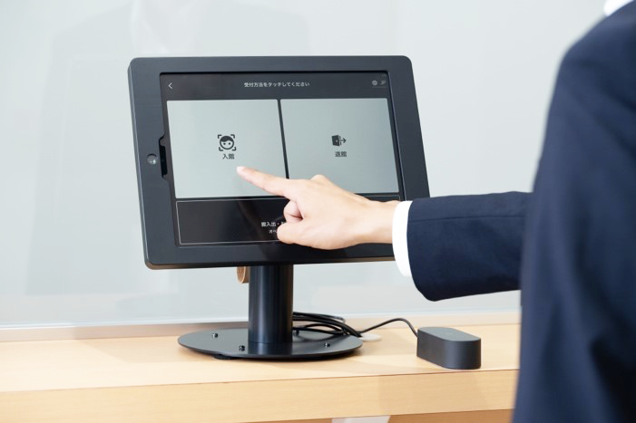 受付に設置されたタブレット上の案内に沿って、入退館手続きを行います。
