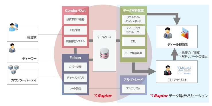 当社は、FX事業者向けに提供している金融取引プラットフォーム「IIJ Raptorサービス」のサービスラインアップを拡充し、FXサービスで日々蓄積されるデータを集約し、可視化、解析することで、収益向上につながる施策を創出する「Raptorデータ解析ソリューション」を、本日より提供開始いたします。また、本ソリューションを、2012年より店頭FXサービスの基盤として「IIJ Raptorサービス」を利用いただいているauカブコム証券株式会社に先行して提供開始したことを、併せてお知らせいたします。