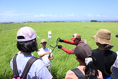 参加者が農業現場におけるITの仕組みや活用方法について学ぶことを目的に、当日は、米作りにおける水田の水管理の課題や、IoTセンサーとスマホ・タブレットを使った水位と水温の測定方法などを、実測データを用いながら分かりやすく説明するとともに、当社のセンサーが導入されている水田を見学しました。