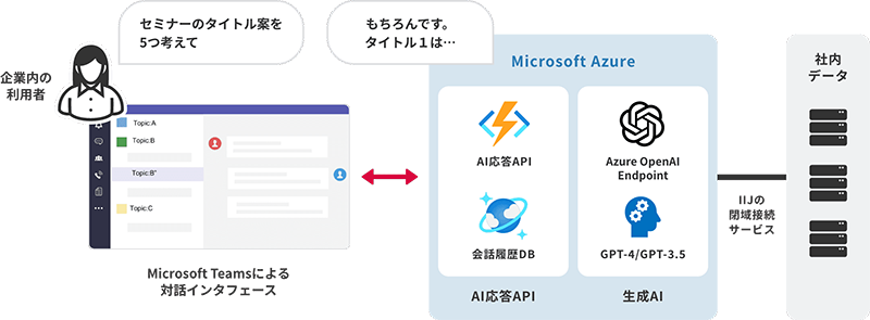 Azure OpenAI Service の利用に必要な環境構築は当社が実施し、お客様は約1ヵ月で利用開始できます。チャットインタフェースとしてMicrosoft Teamsを活用するため、お客様はTeamsでのビジネスチャットと同じ環境でAzure OpenAI Serviceの生成AIを利用できます。会話履歴のデータベースやその他の構成要素はMicrosoft Azure上に用意、Azure OpenAI Serviceとのセキュアな連携を実現し、情報漏えいを防止します。