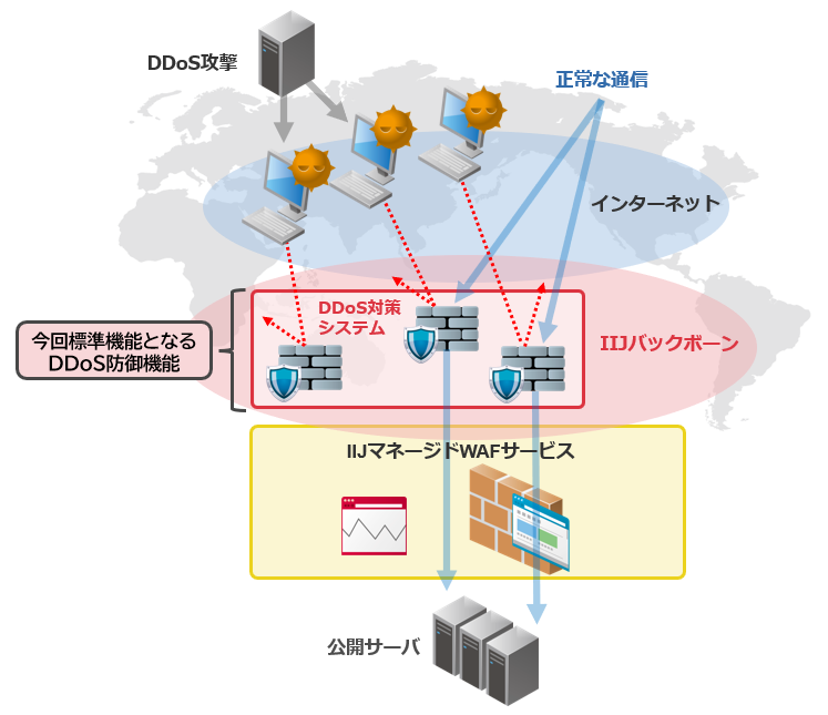 当社は、Webサイトを外部の脅威から防御する「IIJマネージドWAFサービス」において、これまでは別途契約する必要があったDDoS対策機能を、サービスの標準機能として本日より追加費用なしで提供開始します。Webアプリケーションの保護に特化したファイアウォールであるWAF(Web Application Firewall)と、近年日常化しているDDoS攻撃(分散型サービス妨害攻撃)への対策とをあわせて提供することで、お客様はWebサイトに対する主要な脅威に一元的に対応し、防御体制を強化することが可能となります。