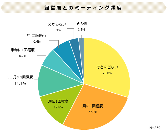 情報システム部門の今後の人員計画について、「現状維持」と回答した企業は昨年と比べ10%近く減り、「増員方針」と回答した企業が約9%増加しました。経営層とのミーティング頻度について、「ほとんどない」という回答が30%近くにのぼり、実施している企業の中では「月に1回程度」との回答が最も多い結果となりました。