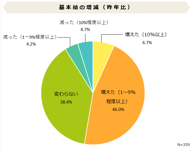 このほかにも、年収や転職意向などキャリアに関する調査結果を紹介しています。これによると、基本給の増減について、約半数が「増えた」と回答した一方、「変わらない」は約38%でした。