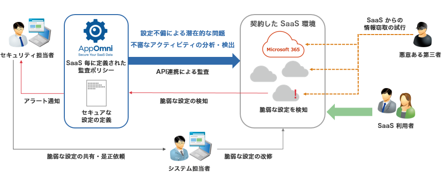 脆弱な設定や不審な操作などを検出し、SaaSごとに異なる環境の安全管理を一括で実現