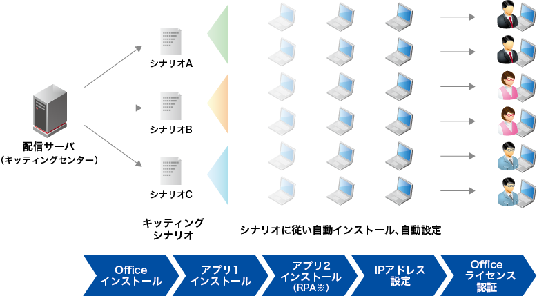 マスターレスキッティング方式は、OSやアプリケーションなどのインストールや設定の手順を「シナリオ化」し、順次対象PCに自動適用するものです。シナリオは、PCの種類や、WindowsOSのバージョンを問わず共通化が可能となるため、機種選択の自由度が高まります。さらに、これまで手作業で実施する必要があった社内のドメイン参加や企業固有の業務アプリケーションのインストールなど個別作業については、RPA(Robotic Process Automation)技術を活用することで自動化し、PCキッティングにおける運用負荷、メンテナンスコストを大幅に削減します。