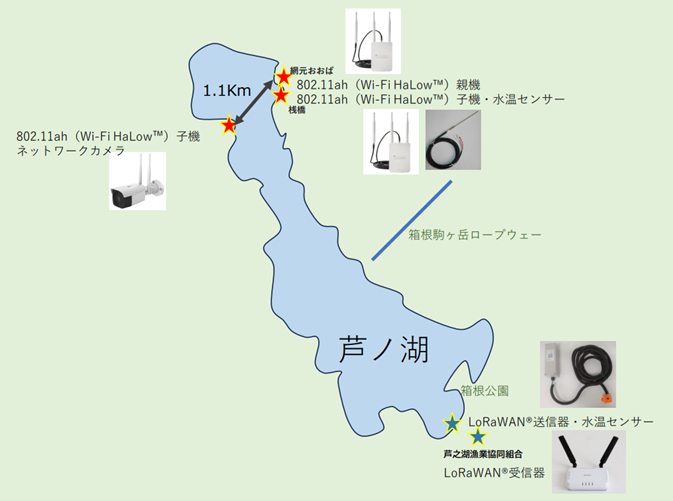 東日本電信電話株式会社 神奈川事業部(神奈川県横浜市、以下「NTT東日本 神奈川事業部」)と株式会社フルノシステムズ(東京都墨田区、以下「フルノシステムズ」)と株式会社インターネットイニシアティブ(東京都千代田区、以下「IIJ」)および芦之湖漁業協同組合(神奈川県足柄下郡箱根町)は、芦ノ湖における監視・管理を効率化かつ強化するため、新たなWi-Fi規格であるIEEE標準規格「802.11ah(Wi-Fi HaLow™)」(以下、「802.11ah(Wi-Fi HaLow™)」)を活用したデジタル監視と、802.11ah(Wi-Fi HaLow™)とLoRaWAN®のLPWA通信(※)を活用した水温センシング管理による実証を開始しました。
