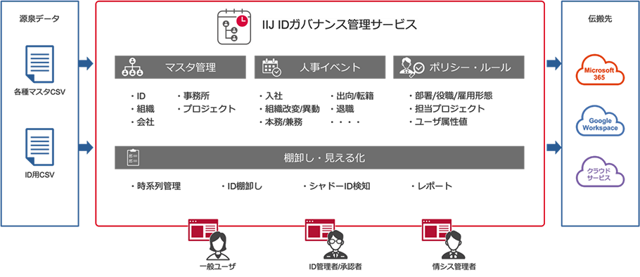 当社は、IDや組織マスタを時系列で一元管理できるクラウド型IDガバナンス管理サービス「IIJ IDガバナンス管理サービス」を、本日より提供開始いたします。本サービスは、社内システムやさまざまなSaaSへのログインに用いるアカウント情報などを管理するID管理機能だけでなく、入退社・異動や組織改編などの人事イベントに対応した日本企業が求める組織マスタ管理および権限管理を有し、なおかつそれらの情報を時系列で管理することが可能です。これにより、ID管理の効率化、コストの削減やセキュリティの強化、組織で使用されるIDと権限情報の一元管理が可能なほか、時系列管理機能により、ユーザの入社から退社までのIDライフサイクルに応じて変化する情報を切れ目なく管理することが可能で、管理者は過去・現在・未来の任意の時点の情報をWeb UI上で確認および調査することができます。
