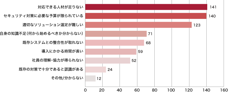 ゼロトラストを実現する上での最大の課題は、「専門人材の不足」と「セキュリティ対策にかかるコスト」でした。企業がセキュリティ対策の導入や運用において予算や人員が足りないと感じていることが多く、特に中小企業では人的リソースが限られているため、対応が遅れている傾向が見られます。また、経営層の理解不足も一因となっており、今後はゼロトラストのメリットを社内にも効果的に訴求していくことが重要です。