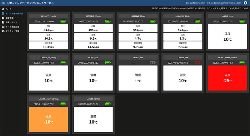センシングデータのほか、データ受信時刻やセンサーの電池ステータスなど最新の情報を一覧表示 |