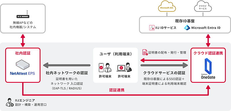 当社は、証明書認証によって強固なセキュリティを担保するとともに、社内システムからクラウドサービスまでを横断した統合的な認証環境を実現する「IIJネットワーク認証ソリューション with Soliton」を本日より提供開始いたします。本ソリューションでは、株式会社ソリトンシステムズ(以下、ソリトン社)の技術を活用し、クライアント証明書によって利用者と端末を厳密に識別することで高度なセキュリティを確保し利便性も両立します。また、社内外の幅広いシステムの統合的な認証環境の設計・構築・運用窓口をワンストップで提供し、初期導入作業や運用業務の負担を軽減します。