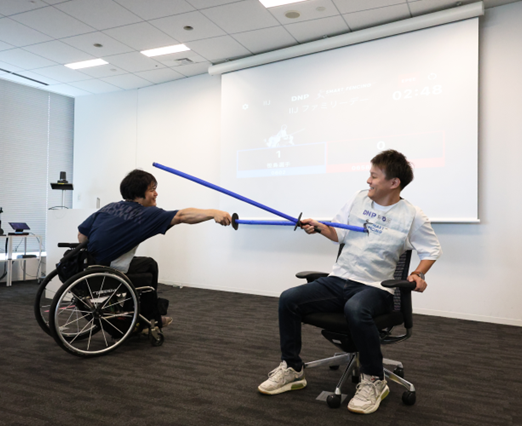 IIJで勤務しながらパラアスリートとしても活躍している、笹島さんとフェンシング対決が可能なコーナーです。私も実際に対決してみましたが、サーベルの使い方が難しく、防御するのに精いっぱいですぐに負けてしまいました…。フェンシングの難しさを痛感しました…。