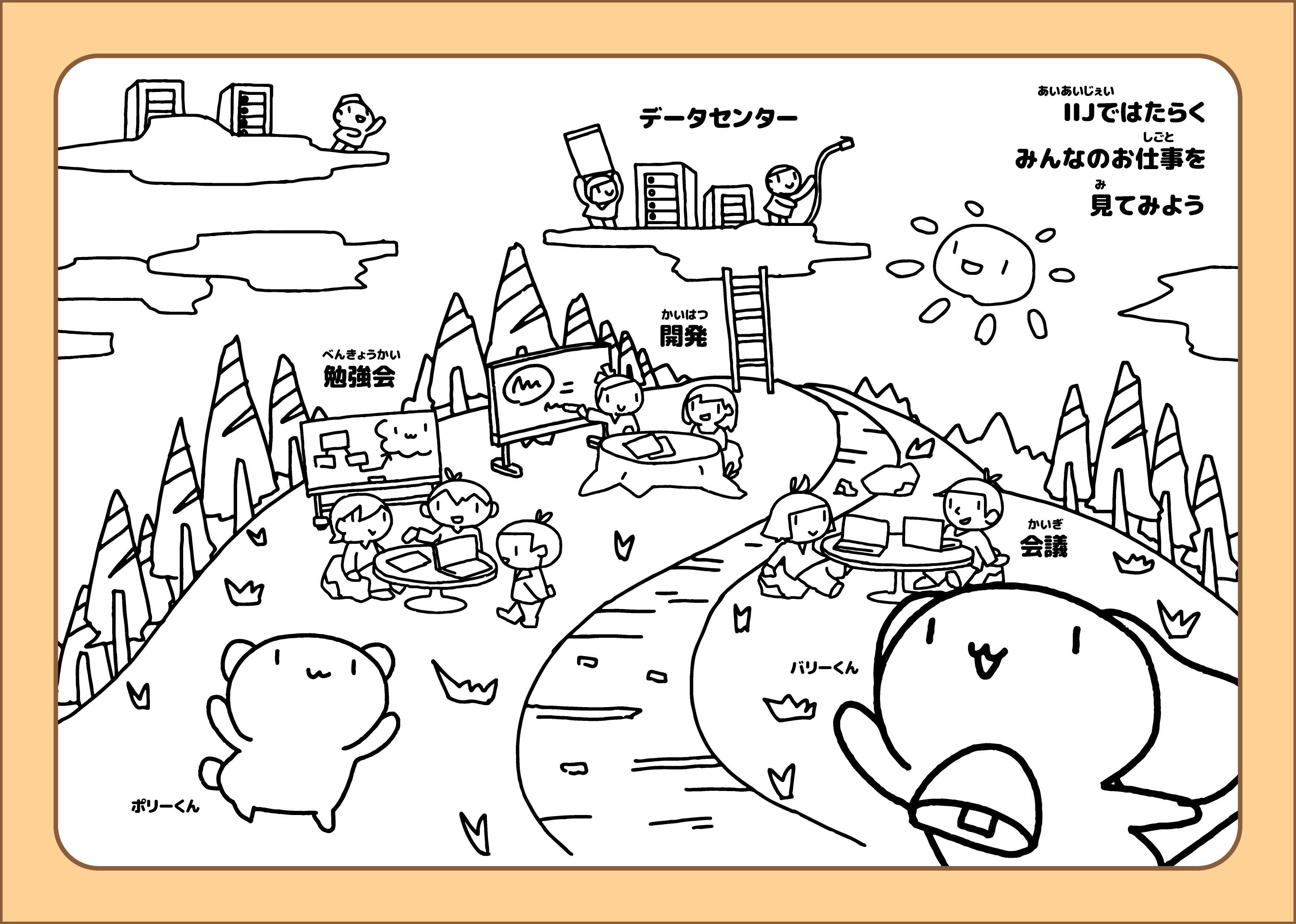 A.画像のようなキャラクタや、IIJのサービスロゴ、技術カンファレンスのデザイン、30周年記念のマグカップ、ファミリーデーのお土産ぬりえなどがありました