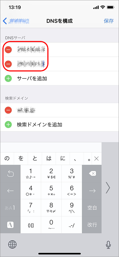 6.既に入っている設定を-をタップして全て削除し、「サーバを追加」をタップしてください。