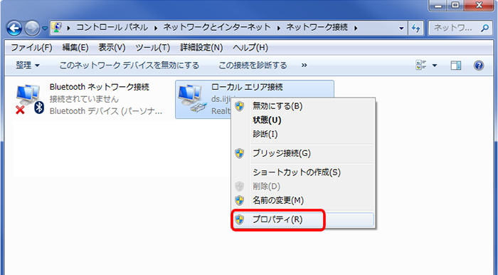 4.お使いのパソコンのネットワーク接続を右クリックし、「プロパティ」をクリックしてください。