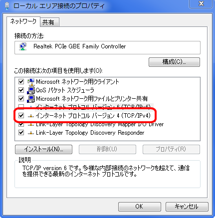 5.プロパティの項目から「インターネットプロトコルバージョン 4 (TCP/IPv4)を選択して「プロパティ」をクリックして下さい。