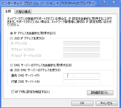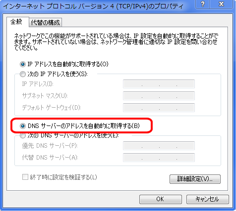 「DNSサーバーのアドレスを自動的に取得する」に切り替えて、OKボタンをクリックして設定を閉じて下さい。