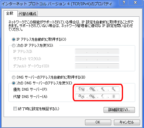 (DNSのIPアドレスは、お客様のご契約のISP様までご確認ください)