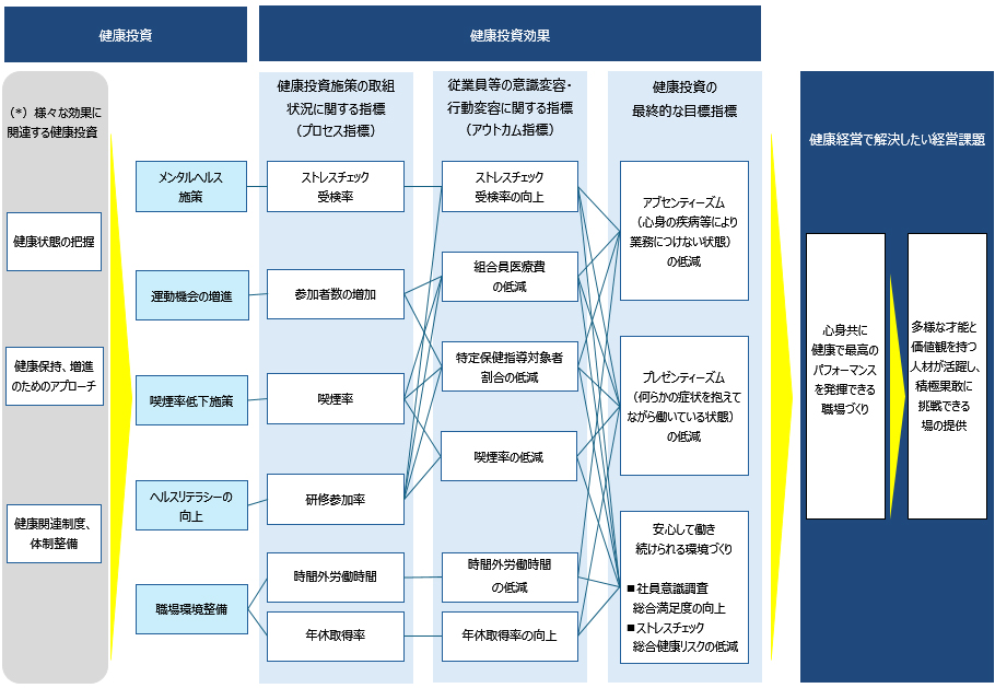 健康投資(取り組み・指標)から健康経営で解決したい経営課題とその解決までの過程を可視化した戦略マップに基づき、取り組みを推進しています。