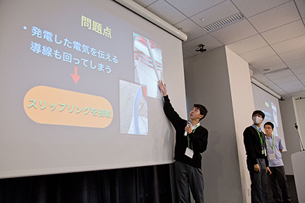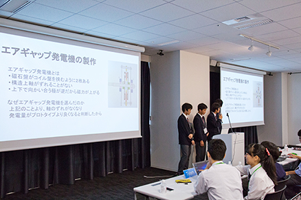プロトタイプの風車の「軸がぶれる」という問題点の改善だけでなく、どのようにすれば風車が効率的に風を受けることができるか、効率よく発電するためにはどうすれば良いかなど、様々なアイデアを考案し、それを一つずつ試しながら発展させるという、積極的な研究を行ってくれました。必ずしも成功ばかりではなかったものの、それぞれの取り組みがどのような結果につながったのか、具体的な資料を添えて発表を行い、参加者・スタッフでの有意義な議論に繋げました。