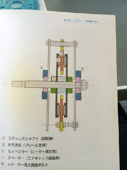 この作業の後、実験を再開しましたが、しばらくすると、また擦れる音がしました。コイルの均一性に加えて、アルミ棒が傾いていることも原因だと思い、いろいろ検討した結果、発電機ごと替えることにしました。発電効率と発電量を両方上げることができそうで、かつ作りやすいものを探した結果、中村昌広氏の本に載っていた、磁石数が現在の2倍の「エアギャップ発電機」にたどり着きました。材料は揃えたので、これから組み立てと設置を行います。
