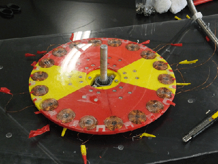 さらに、コイルを止めているセロハンテープと磁石盤が擦れて抵抗となり、発電量が減っていることも問題です。そこで、写真のように銅線で盤とコイルをきつめに縛ることで問題を解決しようとしました。