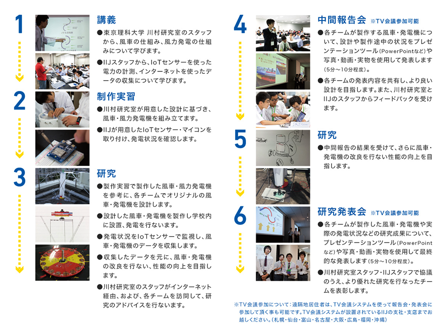 エコ・エネルギーである風力発電とインターネット・IoT技術を題材に、今年は6月から9月までのおよそ3ヵ月間にわたり、各チームでオリジナルの風車風力発電機の設計~製作を行ない、さらにIoT技術を活用して風車風力発電機の発電効率の改良を試みる研究活動を行ないます。