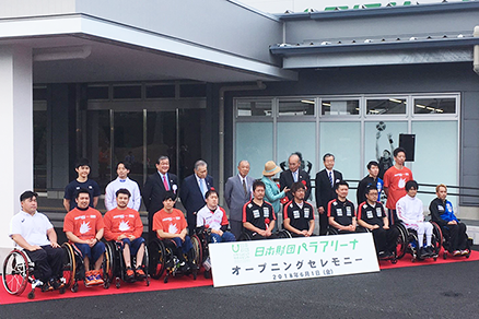 2018年6月1日、東京臨海副都心地区に建設されたパラスポーツ専用体育館「日本財団パラアリーナ」のオープニングセレモニー。(前列・右から2人目が笹島選手)