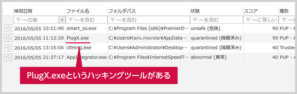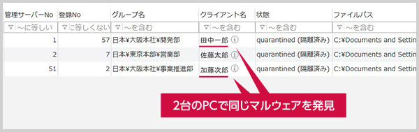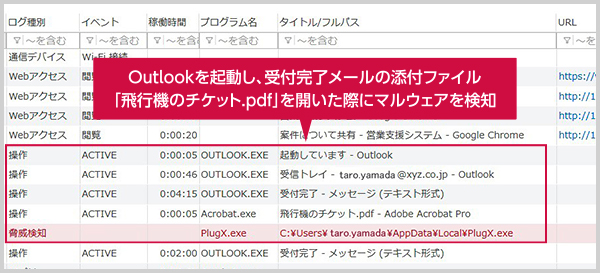 マルウェア検知前後の操作ログから、感染原因となるWebサイト閲覧・メール開封などの行動特定が可能です。