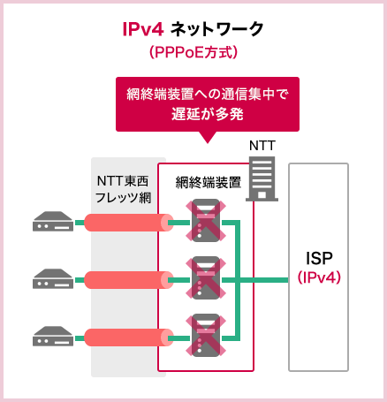 網終端装置へのトラフィック集中によって起こる輻輳。WAN内の通信をIPv6ネットワークにすることで、網終端装置を経由せずに、快適な通信を実現します。
