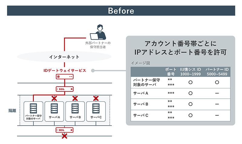 従来の「IDゲートウェイサービス」では、「ポリシーマネージャー」で、ユーザ/ユーザグループ/サービスホスト/サービスホストグループに対するアクセス権をアクセス制御ルールとして細かく設定することができ、アカウント番号帯ごとに、接続先サーバ(IPアドレス)とプロトコル/ポート番号を許可することで制御していました。また、システムごとのサーバ群のセグメントの入口と出口に、IIJが開発した仮想ルータ「SEIL/x86」を設置してフィルタリングすることで、外部からの不正なアクセスを防ぎ、パートナーの担当者が、保守対象のシステムのサーバを踏み台にして、別のサーバにアクセスできないよう制御していました。