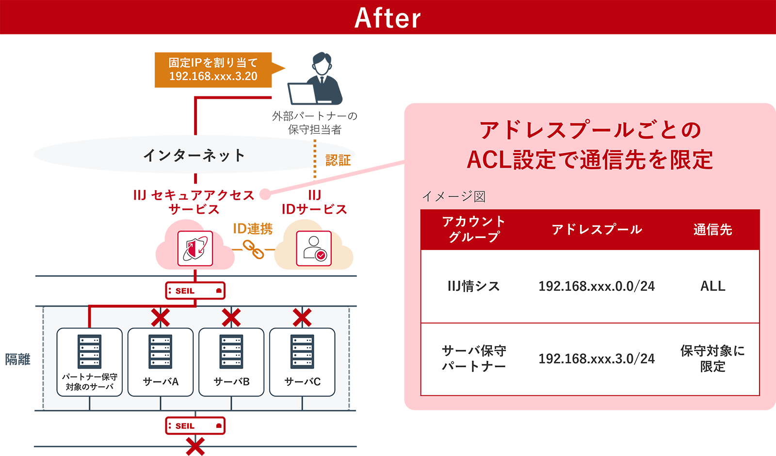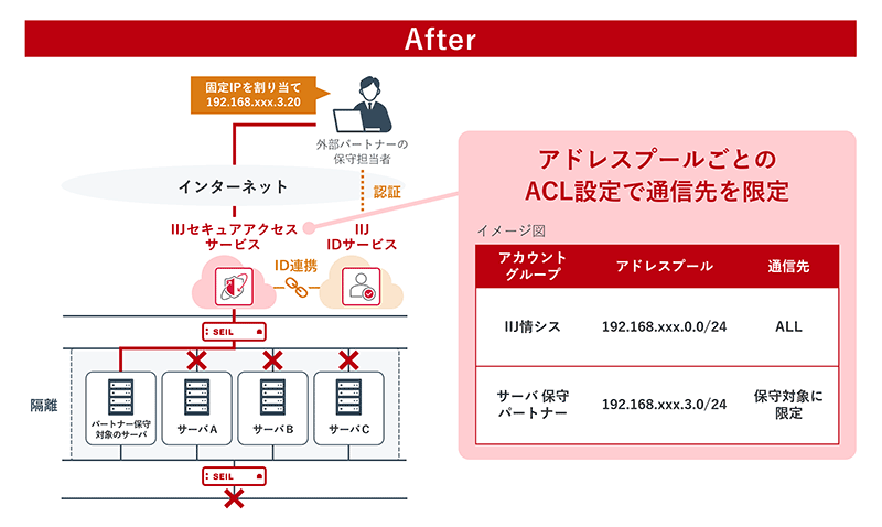 「IIJセキュアアクセスサービス」では、接続したユーザ名に応じて固定IPアドレスを配布することができるので、アカウントごとに固定IPアドレスを割り当て、アドレスプールごとに、ACL設定で(送信元・送信先・ポート番号に基づいて)通信を制御しています。また、仮想ルータ(SEIL/x86)による制御は移行後も変わらず、これらの合わせ技によって、従来と同様に、パートナーの保守担当者のアクセス制御を実現しています。