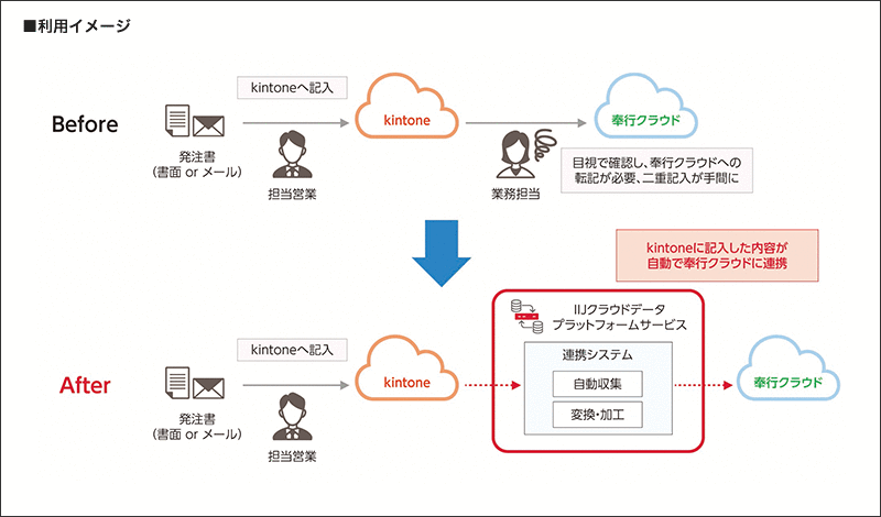 - kintoneの情報を業務担当者がさらに「奉行クラウド」に手入力。二重入力の負担に加え、ヒューマンエラーも課題
