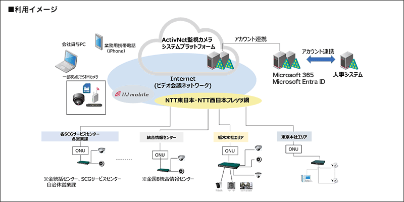 IPカメラの映像データはIIJのクラウドサービス「IIJ GIO」を介して、株式会社Jシステムが提供するクラウド映像監視システム「ActivNet」に転送されます。このActivNetを使って、過去の映像記録を遡って確認したり、各事業所のリアルタイムの状況を把握したりすることができます。