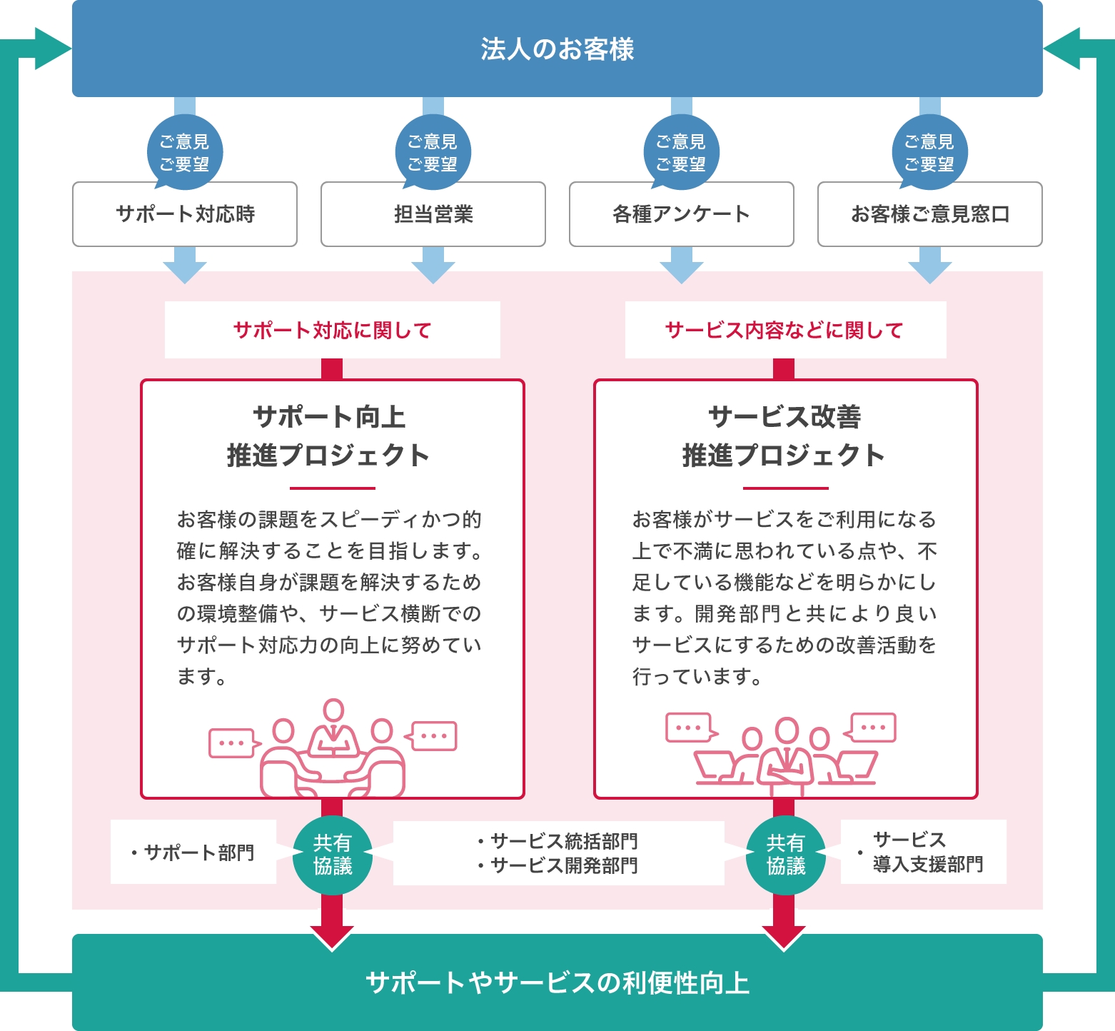 お寄せいただいたご意見は、社内の関係部署で共有し、お客様にご満足いただけるよう、サービス開発やサービス改善に活かしております。