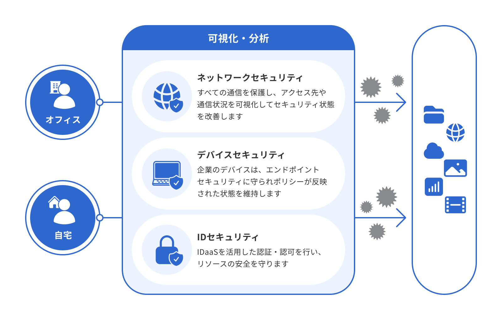 接続する時間、場所、端末の状態などをリアルタイムで判断し、アクセスを制御。ゼロトラストを実現します。