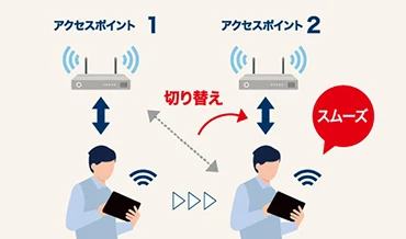 Wi-Fiハンドオーバー対応で、広いオフィス内を移動中も自動的にアクセスポイントをつなぎ替えながら通信接続を維持するため、Wi-Fi通信が途切れにくいです。