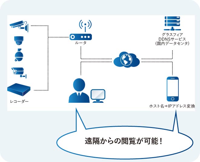 グラスフィア ダイナミックDNSサービスを使用することで、ホスト名だけで簡単にカメラやレコーダーの映像へ、インターネット経由でのアクセスが可能です。
