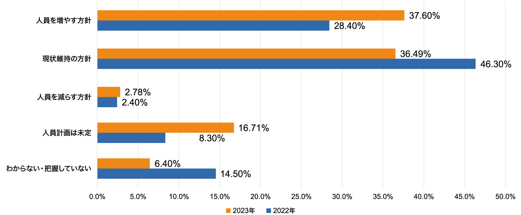 「人員を増やす方針」と回答した企業が昨年対比で増加し、「現状維持」の割合が減少。